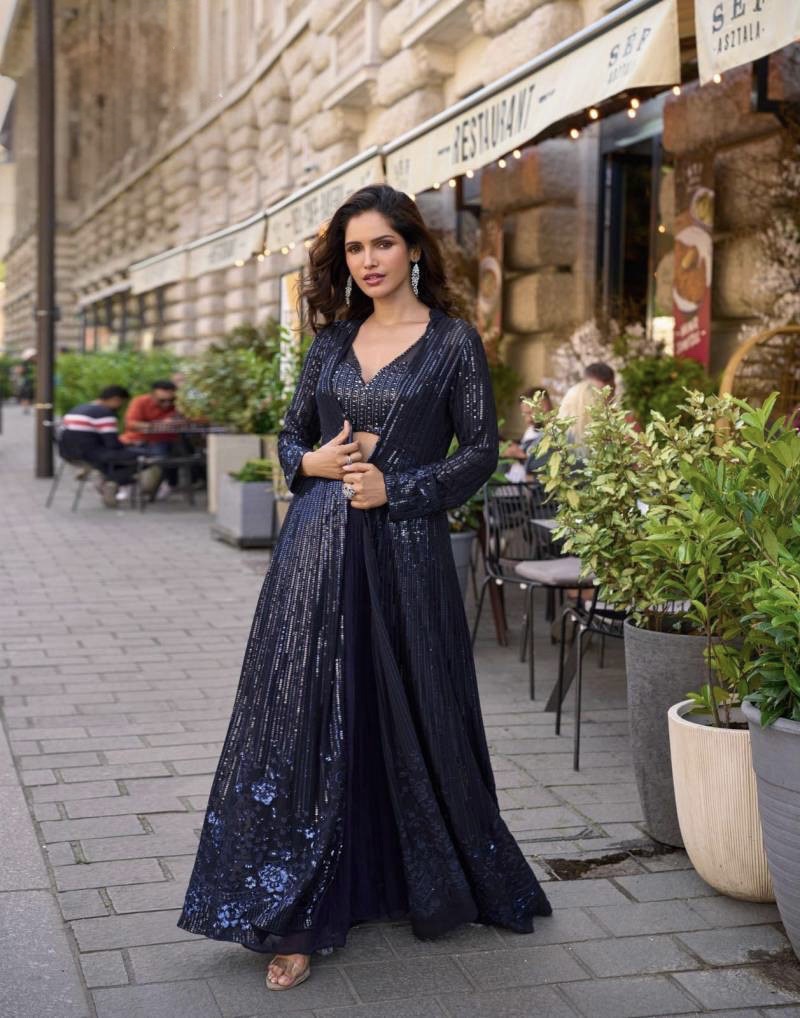 FULL HEAVY LOOK FRONT AND BACK EMBROIDERED FLOOR LENGHT JACKET WITH EMBROIDERED BLOUSE AND PLAZZO